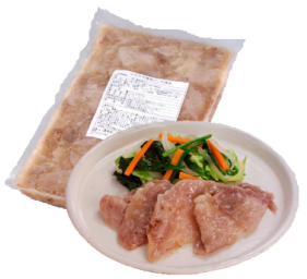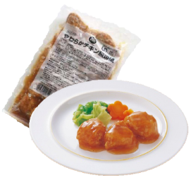 衣がついて揚げてあるので、蒸すだけでからあげが提供できます。やわらかいチキンをベースに大豆たんぱくを加えたんぱくUP。