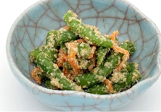 いんげん・人参を彩り良く、鰹と昆布の合わせだしで下味をつけた焙煎した胡麻で和えました。