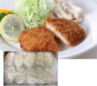 三元豚のロース肉を使用したとんかつです。チルド豚を1フローズンで仕上げ、肉の旨味を引き出すために加水率10%で仕上げました。