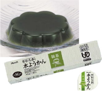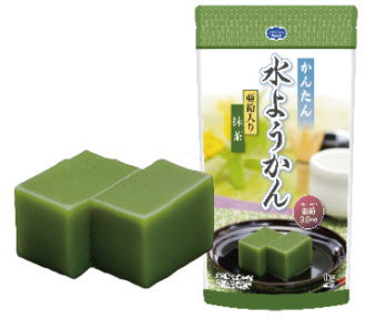 抹茶のほろ苦さを活かし、渋みのある味わいに仕上げた水ようかんです。ユニバーサルデザインフードの区分「舌でつぶせる」です。