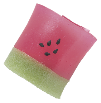 スイカ風味の白餡を羊羹で包み黒ゴマを種に見立てて飾りました。