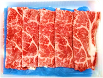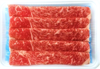 和牛リブロース(肩から背中につながる部位)をスライスしました。色沢(しきたく)が美しく、霜降りになりやすい部位です。肉の旨味と脂肪の甘味をバランス良く味わえます。