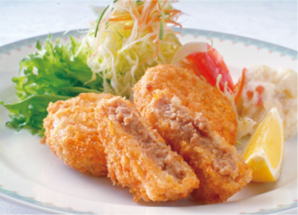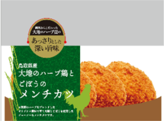 鳥取県産大地のハーブ鶏を使用したメンチカツです。鶏肉と相性に良いごぼうと合わせました。