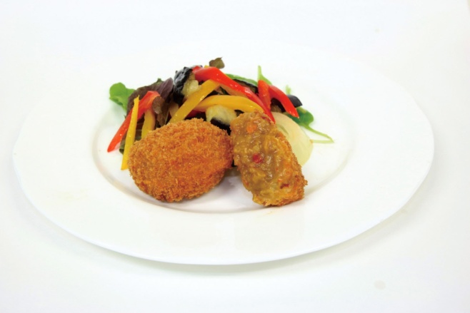 5種野菜とひき肉のカレーコロッケ<40g-20個×5P-2>[冷凍] 5種の野菜と鶏肉を使用した、素材の旨みたっぷりのカレーコロッケです。はちみつで甘みを加えています。