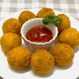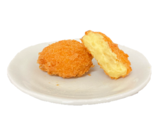 モッツァレラチーズを使用したソースに海鮮具材を合わせ、丸くかわいらしい形のコロッケです。約4センチで老若男女問わず食べやすいサイズに仕上げました。えび・いか・サーモンの3種類があります。